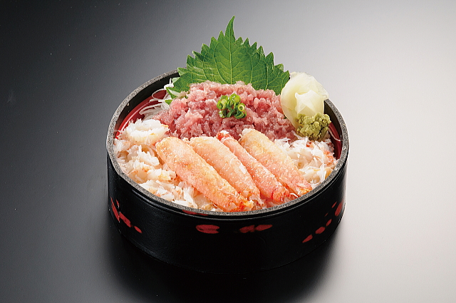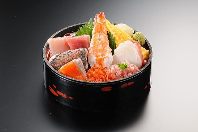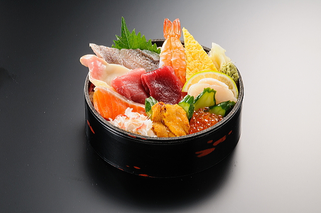 天然まぐろ(中とろ・赤身)・真鯛・生ほたて・ずわいがに・おすすめ貝・自家製玉子・サーモン・牡丹海老・上うに・上いくら・鉄火巻