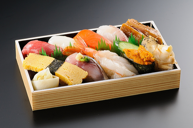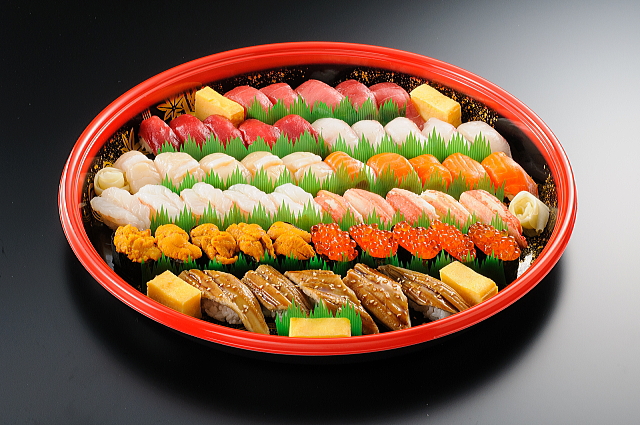 天然まぐろ中とろ・天然まぐろ赤身・サーモン・赤海老・上いくら・生うに・生ほたて・ずわいがに・おすすめ白身・おすすめ光物・自家製煮穴子・真いか・佰食太巻き・いなりのかんぴょう結び・自家製玉子